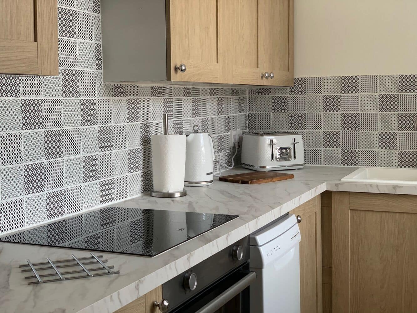 Kitchen: With electric cooker, electric hob, microwave, fridge/freezer, dishwasher and washing machine